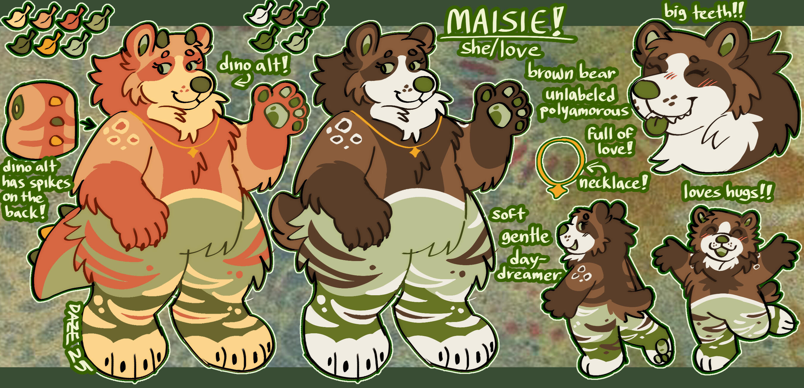 | maisie. she/love. polyamorous. (dino) bear. |