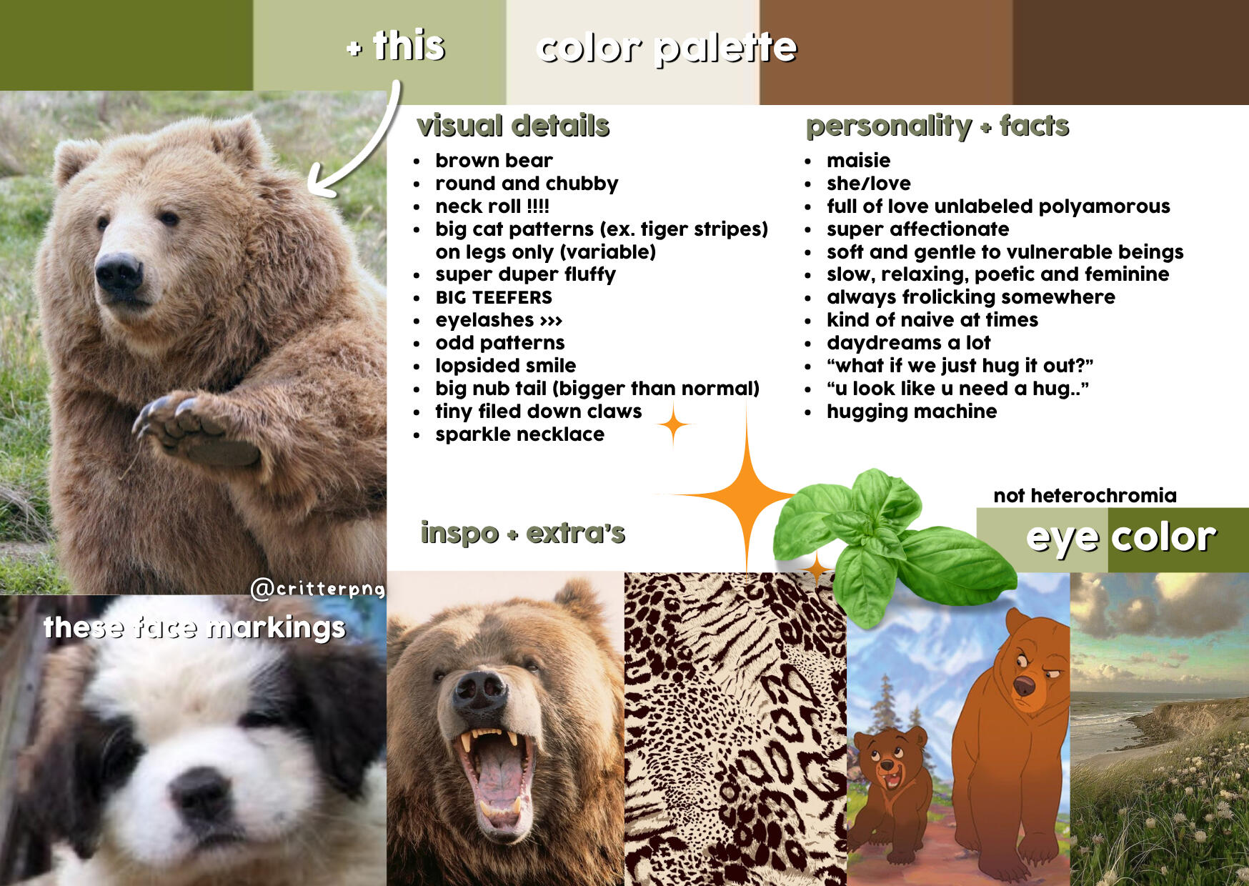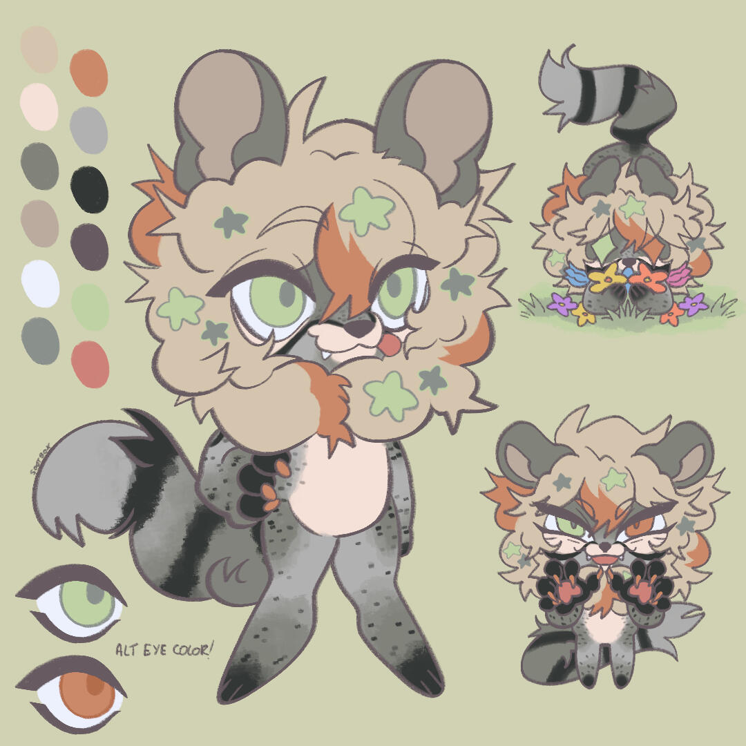 | literally just gave emmy a color palette and a description and said surprise me T^T i said "honestly surprise me, hybrid or not !! i just want it to be really fluffy, not a rodent or bunny anddd something along the lines of this color palette (not strict so feel free to change it)" and then she just made me this huge ass ref, i'm so grateful wtf |