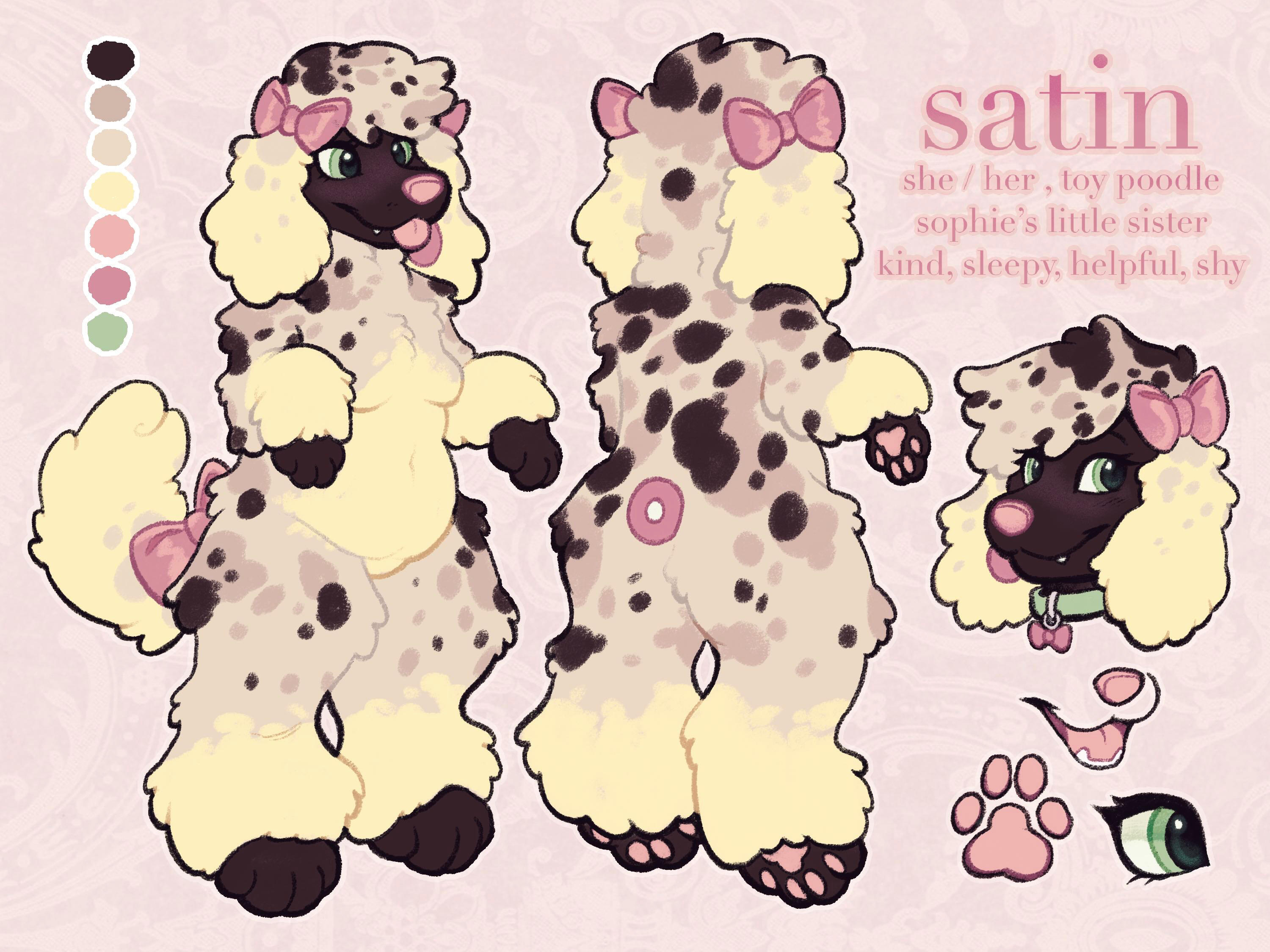 | satin. she/her. unlabeled. toy poodle. |