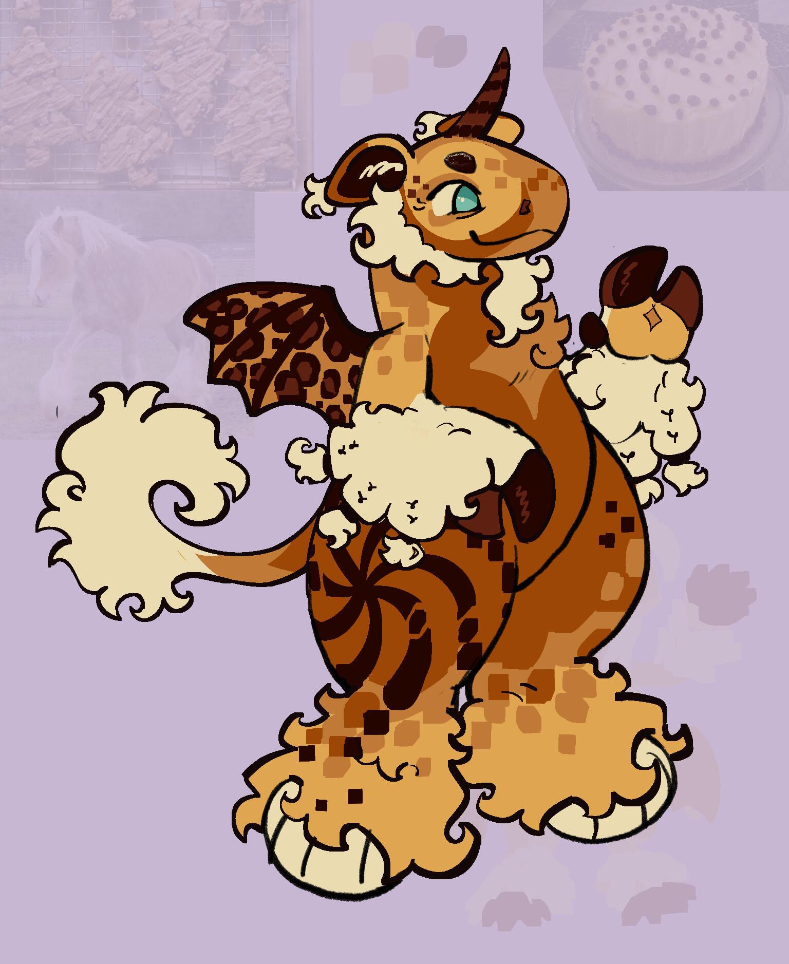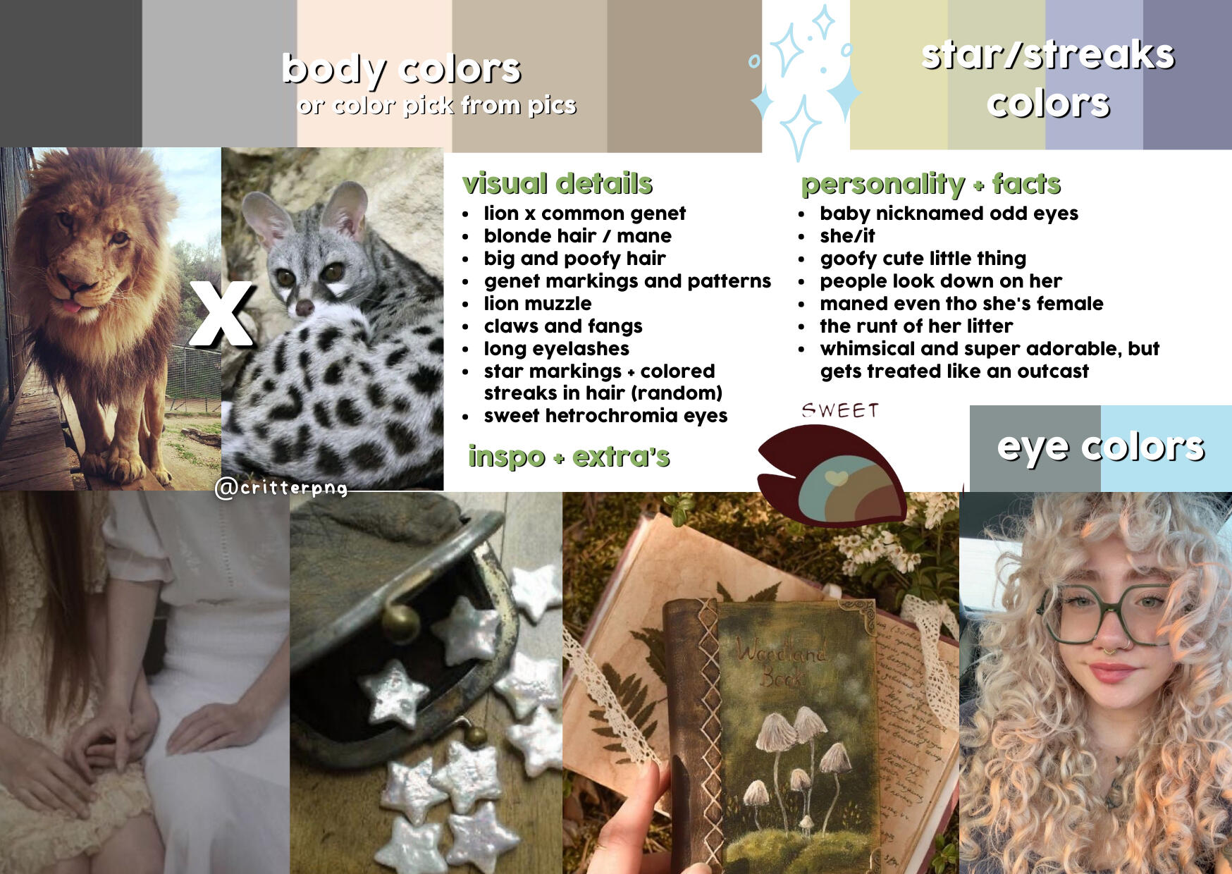 | orphan. people have always looked down on her, her looks cause people to be wary of her. is known as the 'kid who got abandoned at church'by peers. she's the runt of her litter, but her siblings got into rich homes. she has a mane despite being female. she's whimsical and super adorable, but still gets treated like an outcast. |